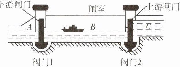 6. 我国三峡工程是举世瞩目的跨世纪工程,三峡大坝上、下游水位差最高可达113m。如图所示是三峡船闸的简易示意图,某船从上游经过船闸驶往下游,请仔细观察,此时