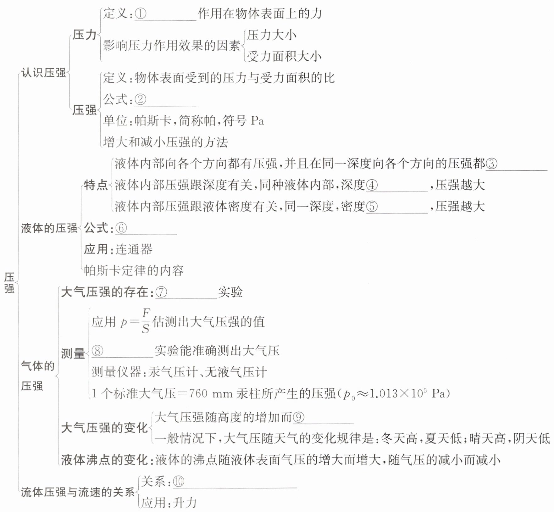 ①垂直 ②$p= \dfrac{F}{S}$ ③相等 ④越深 ⑤越大 ⑥$p= \rho gh$ ⑦马德堡半球 ⑧托里拆利 ⑨减小 ⑩流体流速越大的位置,压强越小;流速越小的位置,压强越大
