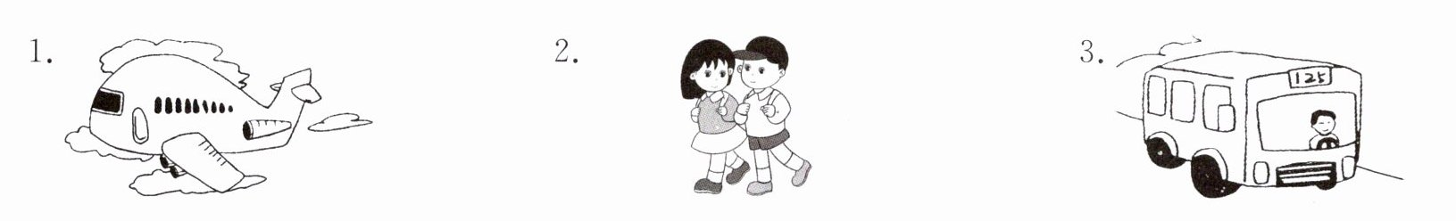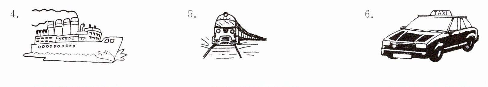 1. by plane 2. on foot 3. by bus 4. by ship 5. by train 6. by taxi