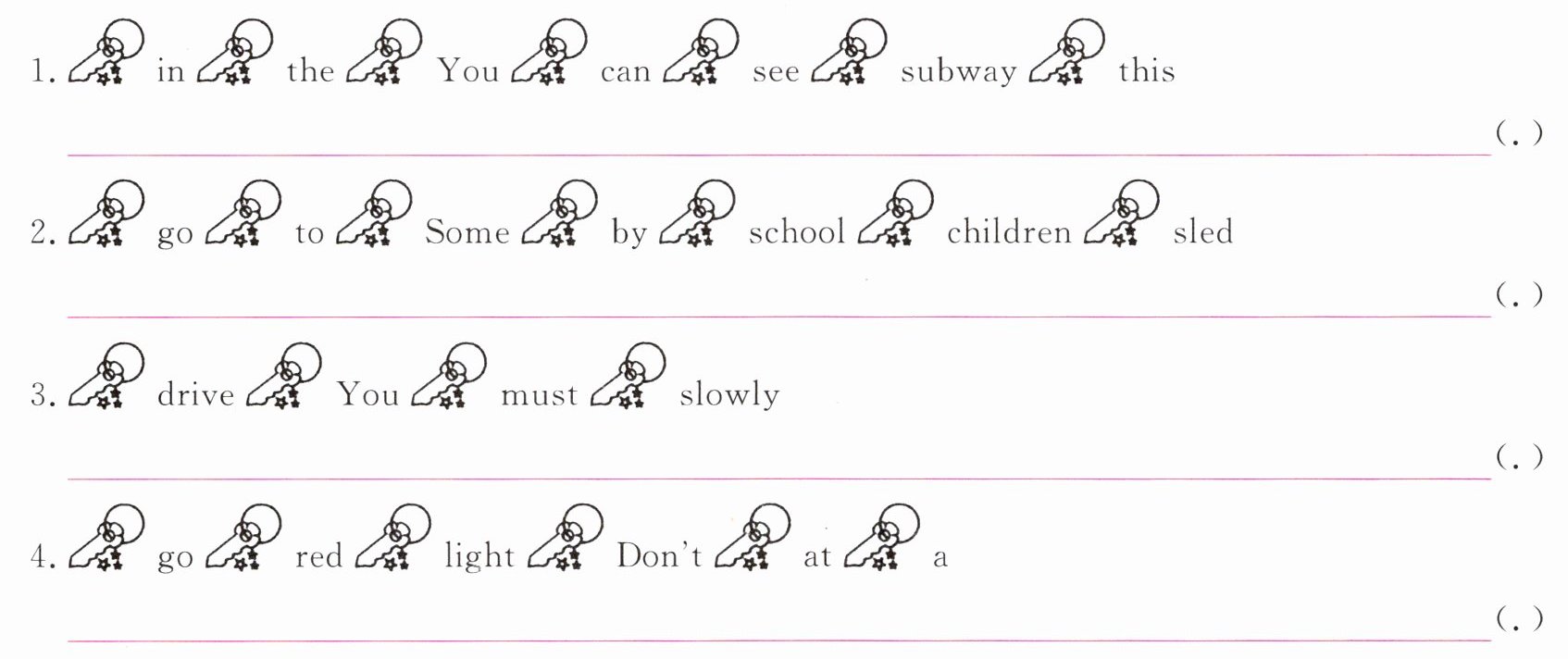 1.You can see this in the subway. 2.Some children go to school by sled. 3.You must drive slowly. 4.Don't go at a red light.