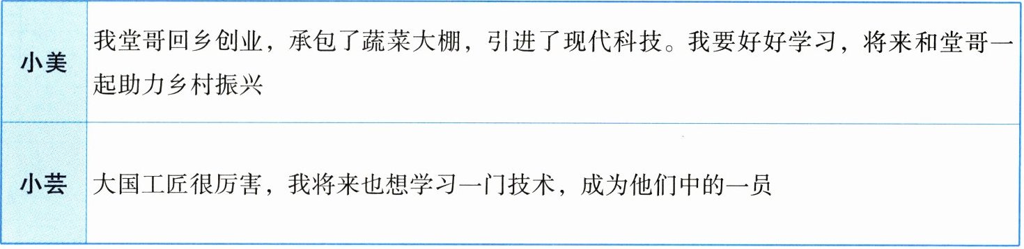 | 小美 | 我堂哥回乡创业,承包了蔬菜大棚,引进了现代科技。我要好好学习,将来和堂哥一起助力乡村振兴 |