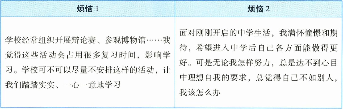 | 学校经常组织开展辩论赛、参观博物馆……我觉得这些活动会占用很多复习时间,影响学习。学校可不可以尽量不安排这样的活动,让我们踏踏实实、一心一意地学习 | 面对刚刚开启的中学生活,我满怀憧憬和期待,希望进入中学后自己各方面能做得更好。可是无论我怎样努力,总是达不到心目中理想自我的要求,总觉得自己不如别人,我该怎么办 |