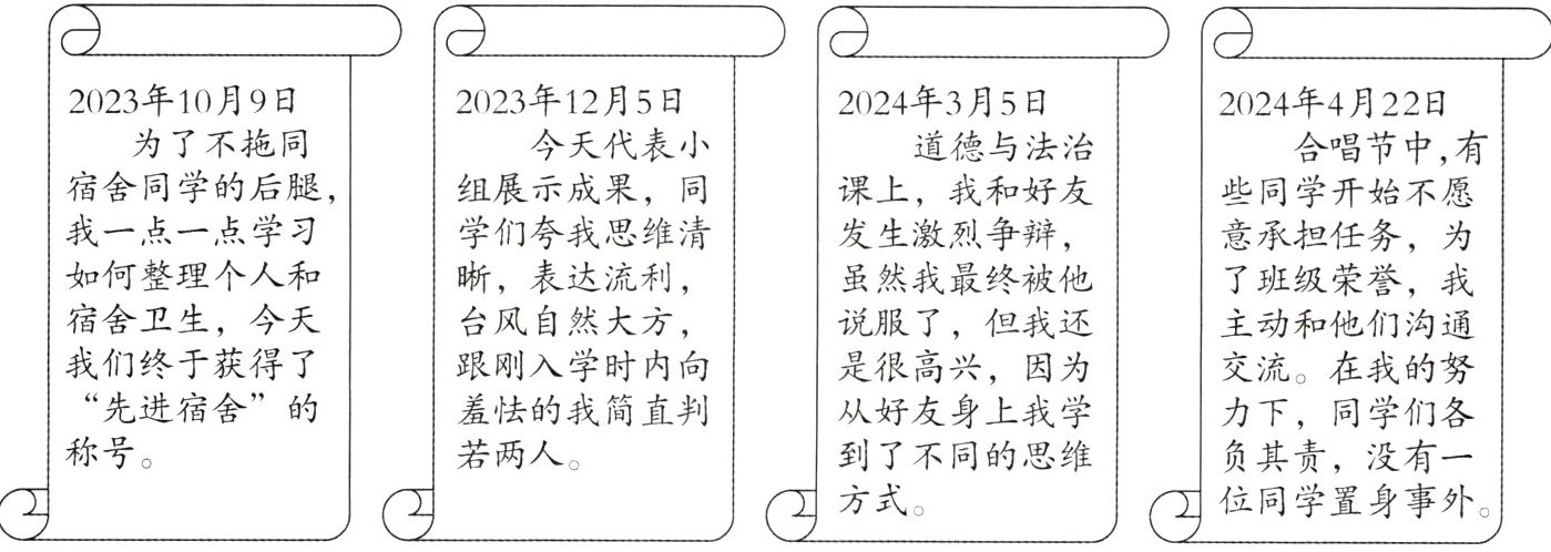 七年级(2)班学生小缘在本学期结束时,要跟随父母到另外一个城市上学。即将离开时,他脑海中浮现出班级生活的点点滴滴。