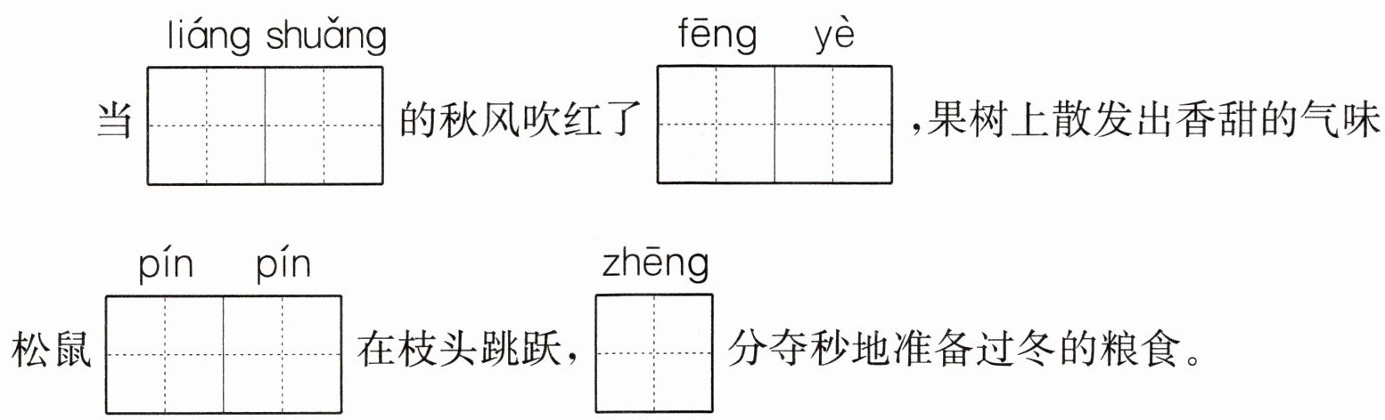3. 它把黄色给了银杏树,黄黄的叶子像一把把小扇子,扇哪扇哪,扇走了夏天的炎热。(想一想,秋天的雨还会把颜色分给谁?照样子,写句子)