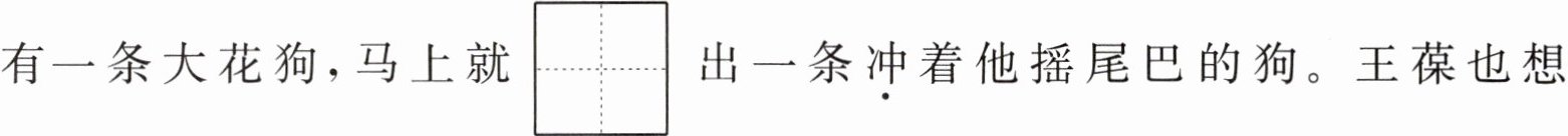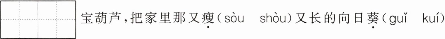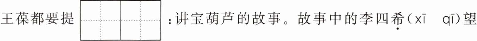 无论是奶奶想给王葆洗脚丫(yā yá),还是给他剪脚$\begin{array}{|c|c|}\hline 指&甲\\\hline &\\\hline\end{array}\begin{array}{|c|c|}\hline 条&件\\\hline &\\\hline ,$王葆都要提$\begin{array}{|c|c|}\hline 冒&\\\hline &\\\hline\end{array}\begin{array}{|c|c|}\hline &\\\hline &\\\hline $:讲宝葫芦的故事。故事中的李四希(xī qī)望有一条大花狗,马上就$\begin{array}{|c|c|}\hline 得&到\\\hline &\\\hline\end{array}\begin{array}{|c|c|}\hline &\\\hline &\\\hline $出一条冲着他摇尾巴的狗。王葆也想$\begin{array}{|c|c|}\hline 最&好\\\hline &\\\hline\end{array}\begin{array}{|c|c|}\hline &\\\hline &\\\hline $宝葫芦,把家里那又瘦(sòu shòu)又长的向日葵(guǐ kuí)变成$\begin{array}{|c|c|}\hline &\\\hline &\\\hline\end{array}\begin{array}{|c|c|}\hline &\\\hline &\\\hline $的。
