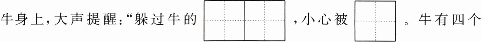 ,一下子蹦到牛身上,大声提醒:“躲过牛的牙齿