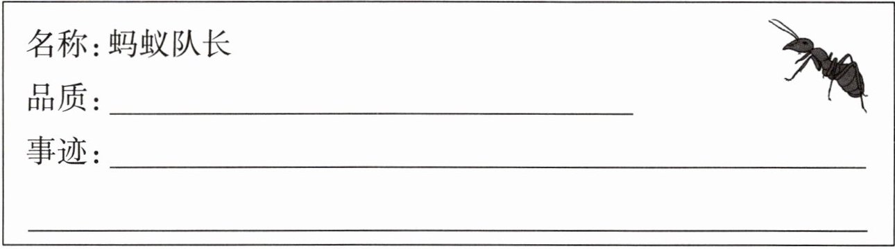品质:以身作则、关爱同伴、遵守纪律。事迹:在搬运粮食时,蚂蚁队长发现一块大奶酪,它带头遵守纪律,让年龄最小的蚂蚁吃掉了诱人的奶酪渣。
