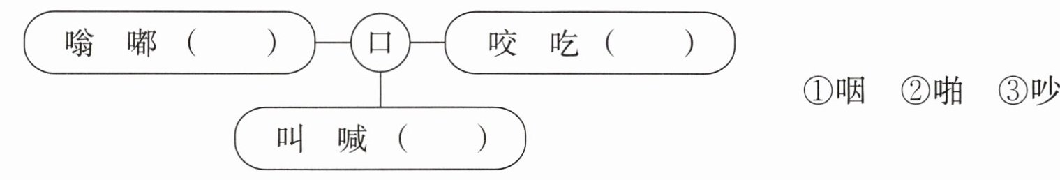 三、揣摩下图中汉字的分类规律,将所给的三个汉字的序号填写到相应的括号中。