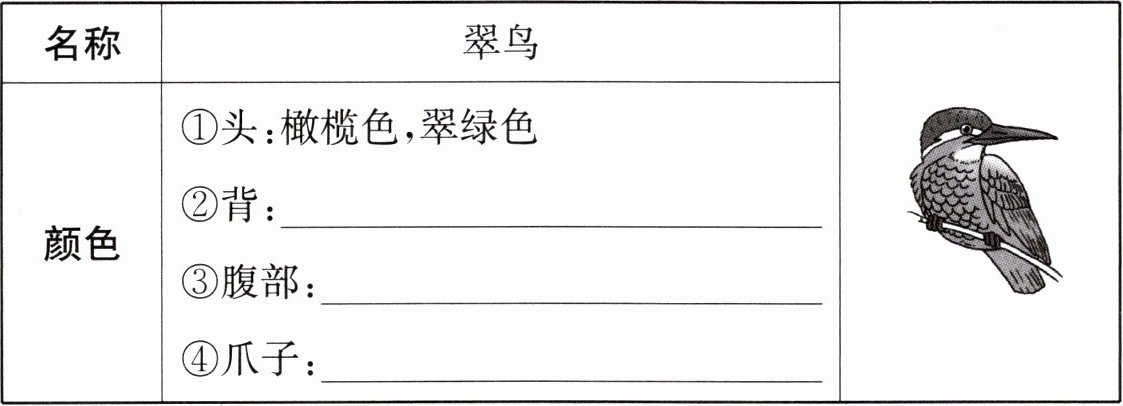1. 根据作者对翠鸟的观察,完成下面的观察记录单。