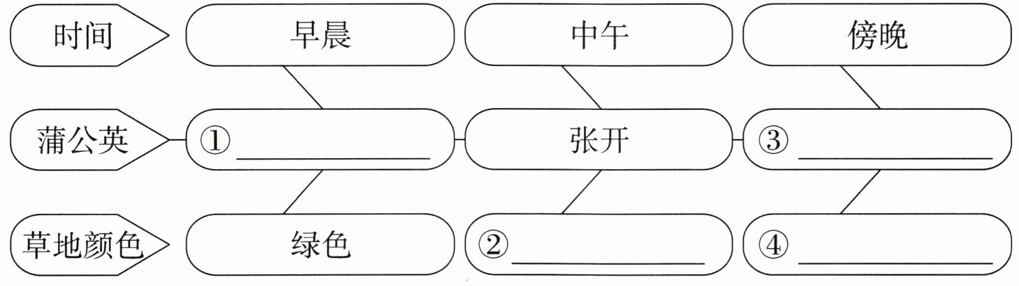 1. ①合拢 ②金色 ③合拢 ④绿色 2. 原来,蒲公英的花就像我们的手掌,可以张开、合上。花朵张开时,花瓣是金色的,草地也是金色的;花朵合拢时,金色的花瓣被包住了,草地就变成绿色的了。3. 仔细观察 4. C