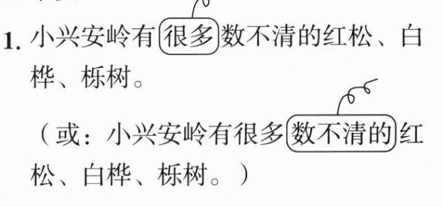 1. 小兴安岭有很多数不清的红松、白桦、栎树。(用修改符号修改句子)