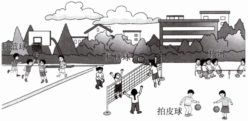 有的同学在打篮球,他们灵活地运球、投篮,引得周围同学阵阵欢呼;有的同学在拔河,大家紧紧抓住绳子,齐心协力往后拉;还有的同学在拍皮球,皮球有节奏地跳动着,发出“砰砰”的声音。