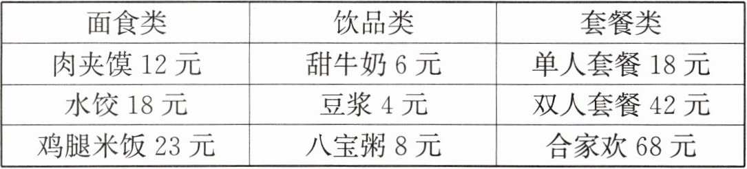 |水饺18元|豆浆4元|双人套餐42元|