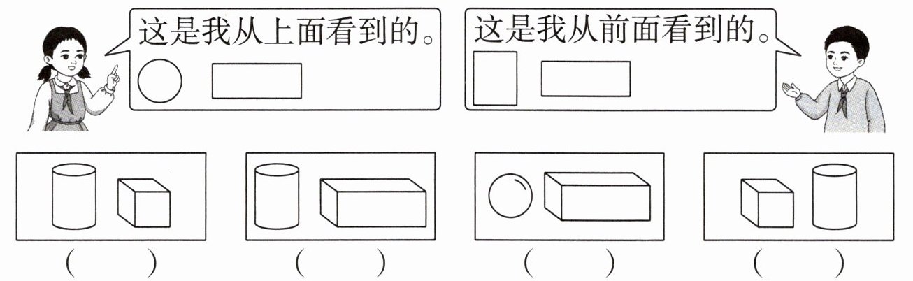 五、他们看到的可能是哪两个立体图形?在正确的图形下面的( )里画“√”。