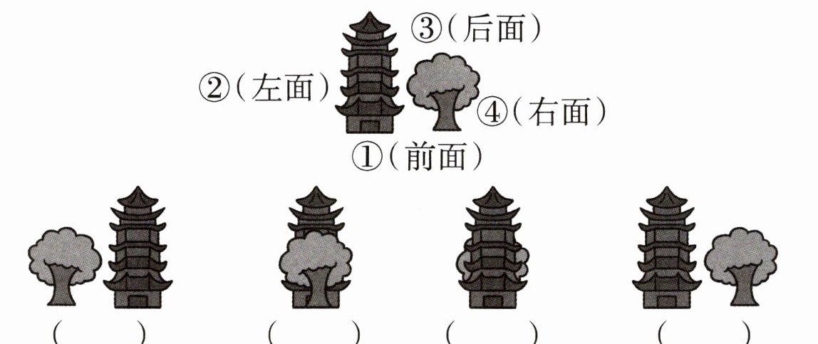 四、奇奇画出从不同位置看到的古塔,将不同位置的序号填在对应的括号里。