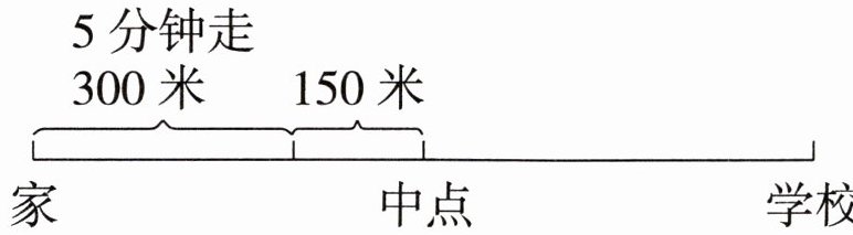小红从家出发去学校,5分钟走了300米,再走150米就到中点。小红家到学校一共有多少米?(可以先画图,再解答)