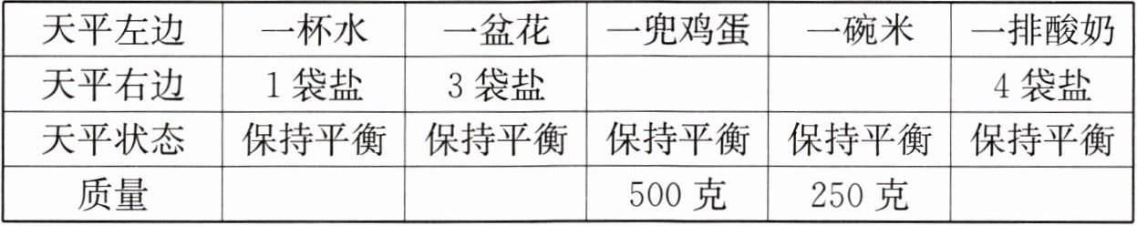 一、现在有一台没有砝码的天平和几袋各 250 克的盐,阳光小组利用这些资源来测量一些生活用品的质量,请你帮他们完成下表。