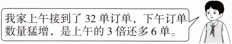$我家上午接到了32单订单,下午订单数量猛增,是上午的3倍还多6单。$