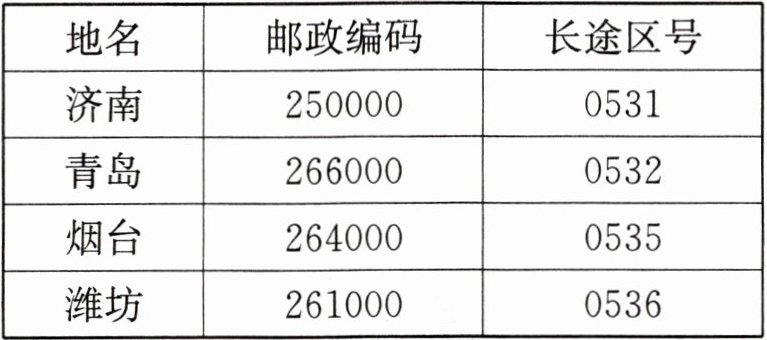四、下表是山东省部分地区的邮政编码(市区)和长途区号。