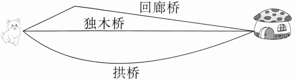 三、小猫想以相同的速度通过下面的三座桥过河回家,它走哪座桥最快?为什么?