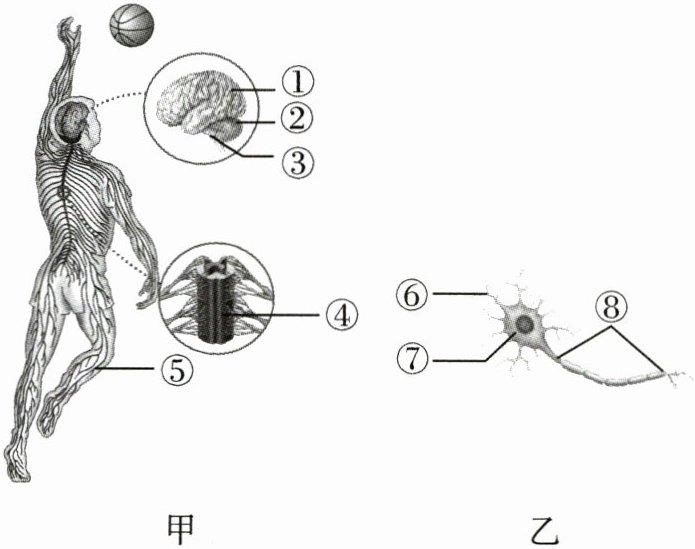 7. 篮球联赛对运动员的智慧和体能都是很大的考验。请结合神经系统的组成示意图(图甲)及神经元的结构示意图(图乙),分析并回答下列问题。