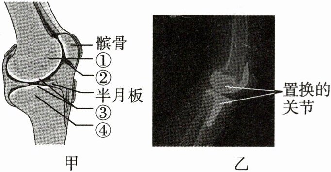 9. 膝关节是人体最复杂的关节(如图甲)。骨性关节炎是一种常见的关节疾病,多发于中老年人,当患者关节损伤严重时,可通过人工关节置换术来代替受损关节(如图乙)。下列有关叙述错误的是(