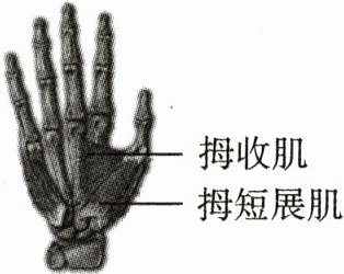 10. 握手是人与人之间表示友好的一种礼仪。握手时,大拇指要向手心运动。下图是人右手掌心面骨骼及部分肌肉示意图,下列相关叙述错误的是(