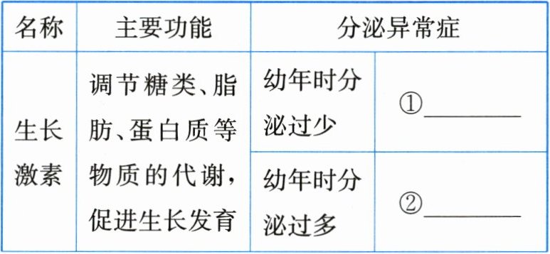 |生长激素|调节糖类、脂肪、蛋白质等物质的代谢,促进生长发育|幼年时分泌过少 ①