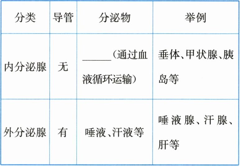 (通过血液循环运输)|垂体、甲状腺、胰岛等||外分泌腺|有|唾液、汗液等|唾液腺、汗腺、肝等|
