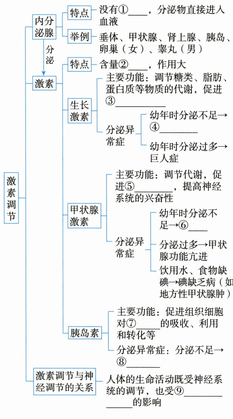 ①导管 ②少 ③生长发育 ④侏儒症 ⑤生长发育 ⑥呆小病 ⑦葡萄糖 ⑧糖尿病 ⑨激素调节