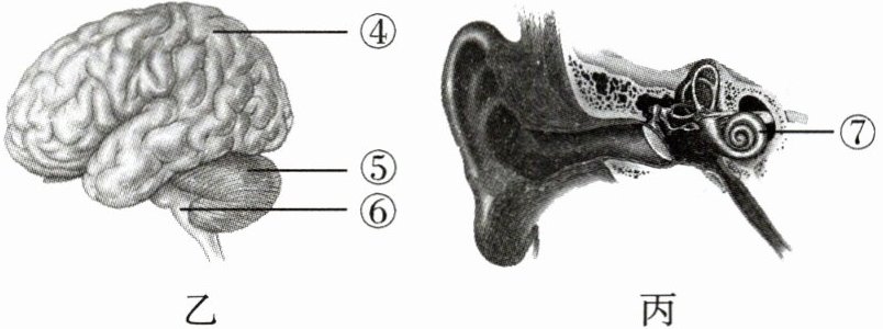 A 解析:呼吸加快、心跳加速主要与⑥脑干的调节有关;②晶状体和③玻璃体都是眼球的基本结构,它们对进入眼球的光具有折射作用,使光能够聚焦在①视网膜上形成清晰的物像;视觉和听觉分别在④的视觉中枢和听觉中枢形成;视网膜上有许多对光敏感的细胞,⑦耳蜗内有对听小骨传来的振动敏感的感觉细胞。