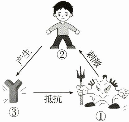 B 解析:病原体侵入人体后,会刺激淋巴细胞产生抗体。所以,题图中的①代表病原体,②代表人体内的淋巴细胞,③代表抗体。