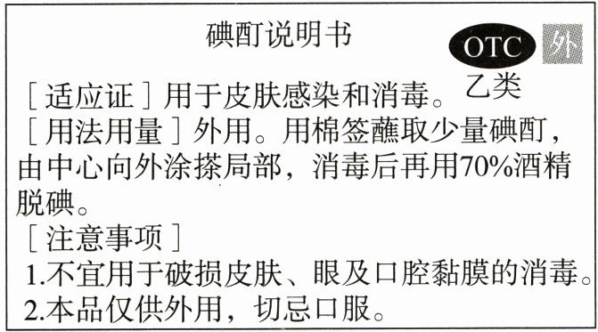 2. 下图所示为家庭常用药碘酊的说明书的部分内容。下列用药方式不安全的是(