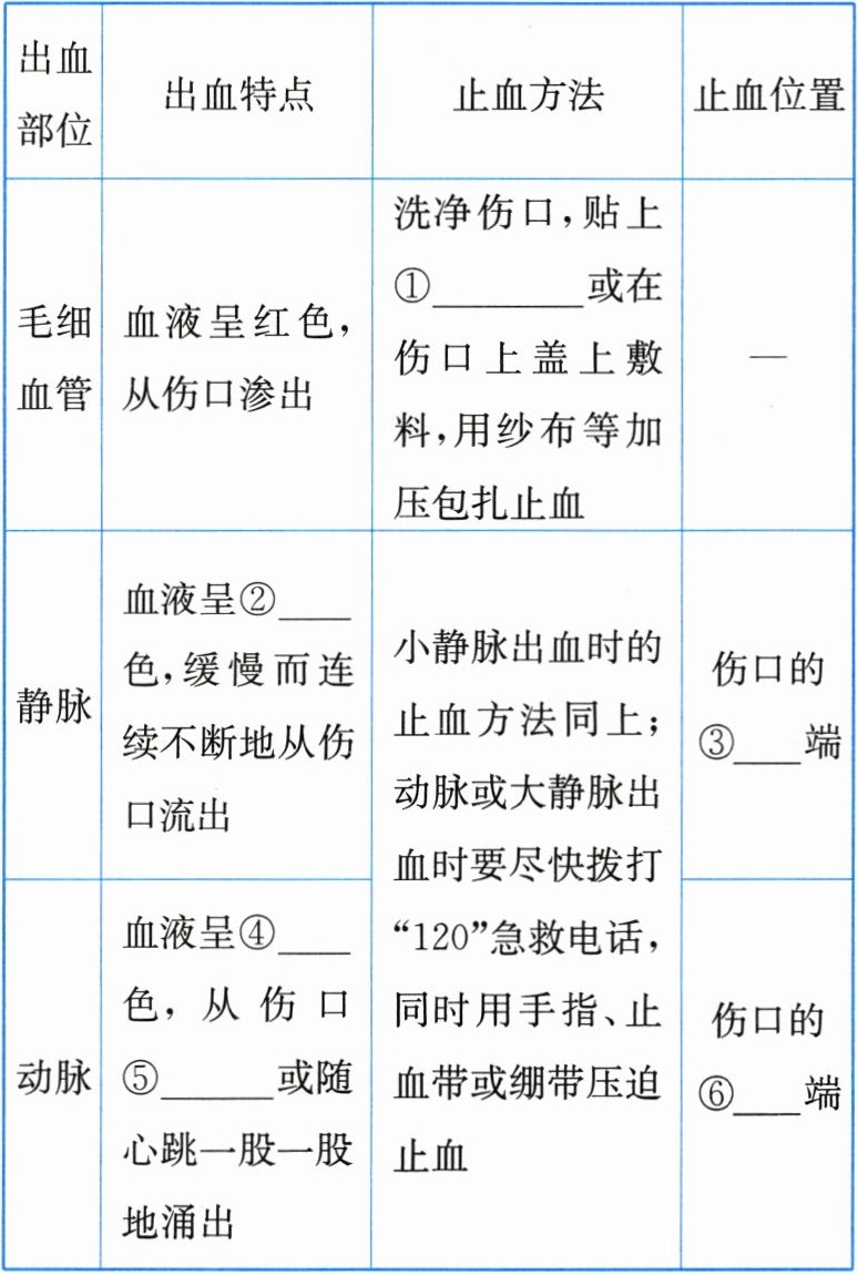 或在伤口上盖上敷料,用纱布等加压包扎止血|—||静脉|血液呈②