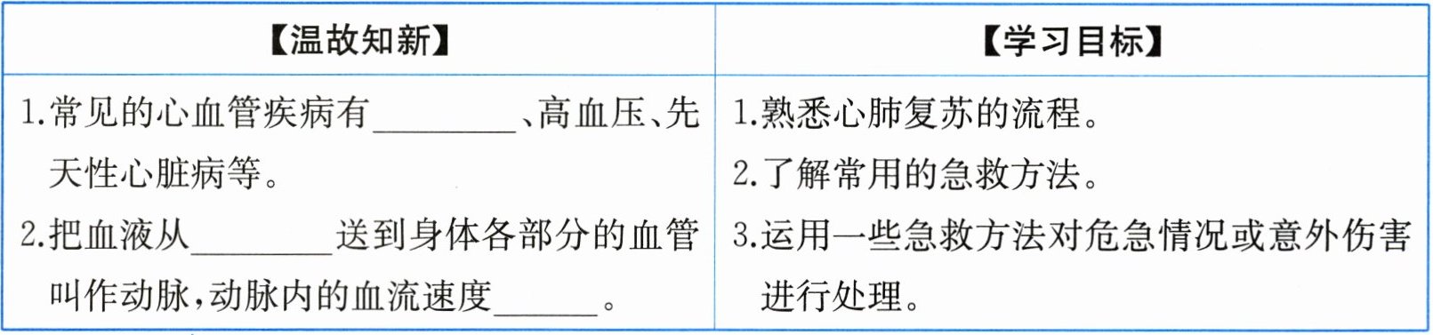 。|1.熟悉心肺复苏的流程。2.了解常用的急救方法。