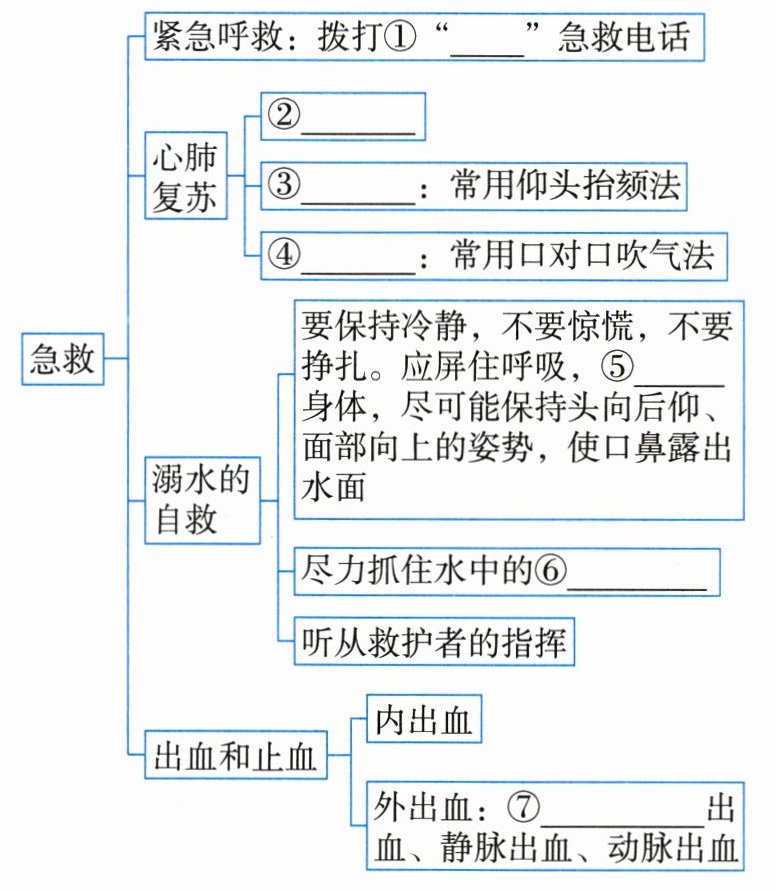 ①120;②胸外心脏按压;③保持呼吸道通畅;④人工呼吸;⑤放松;⑥漂浮物;⑦毛细血管