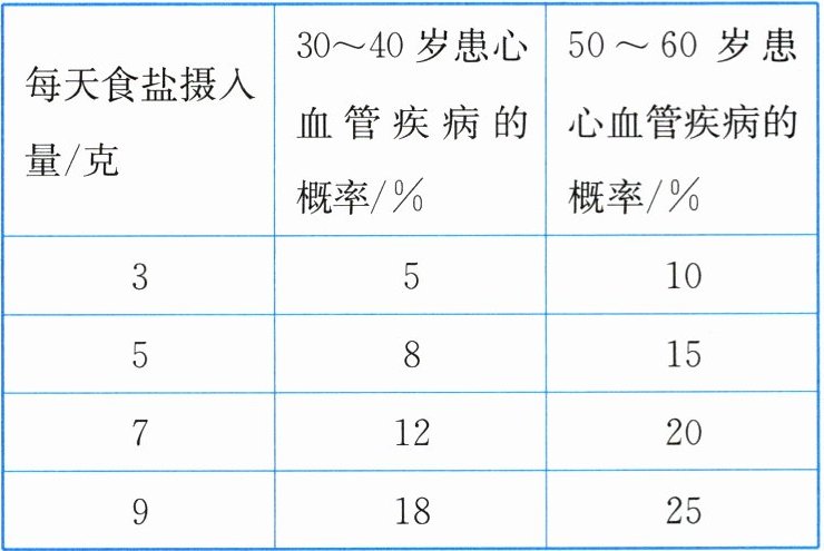 )|每天食盐摄入量/克|30~40岁患心血管疾病的概率/%|50~60岁患心血管疾病的概率/%|