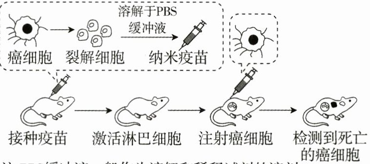 A 解析:纳米疫苗是利用癌细胞制备的,但并非就是癌细胞,A项错误。由题图可知,小鼠的淋巴细胞参与了免疫反应,B项正确。该免疫是针对癌细胞产生的,属于特异性免疫,C项正确。在小鼠体内检测到死亡的癌细胞,说明纳米疫苗引发的免疫反应起到了杀死癌细胞的作用,即纳米疫苗有效,D项正确。