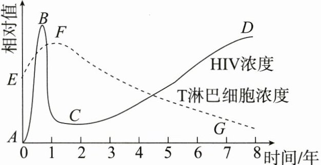 C 解析:在感染初期,HIV会迅速增殖,导致HIV浓度迅速上升,所以曲线AB段变化的原因是HIV大量增殖;在HIV侵入人体后,人体的免疫系统会产生免疫反应,导致HIV浓度略有下降,所以曲线BC段的变化是免疫系统发挥作用的结果;曲线EF段T淋巴细胞浓度上升是细胞分裂和细胞分化的结果,这种变化是HIV刺激相应的淋巴细胞导致的;G点时,HIV浓度非常高,而T淋巴细胞浓度很低,这意味着人体的免疫系统功能已经严重受损。