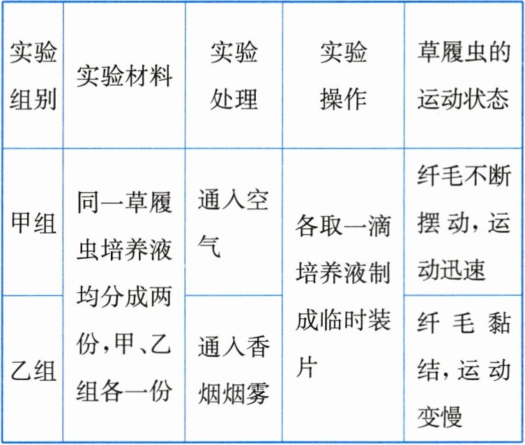 |甲组|同一草履虫培养液均分成两份,甲、乙组各一份|通入空气|各取一滴培养液制成临时装片|纤毛不断摆动,运动迅速|