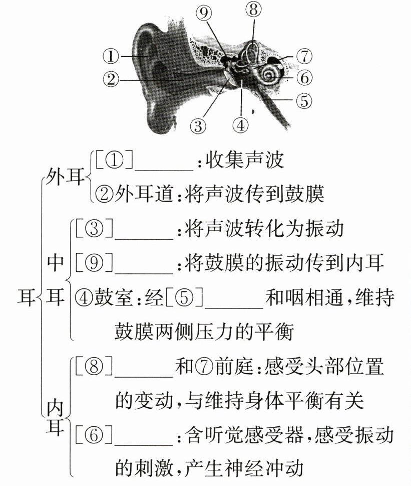 $和⑦前庭:感受头部位置的变动,与维持身体平衡有关\\ [⑥]$耳蜗