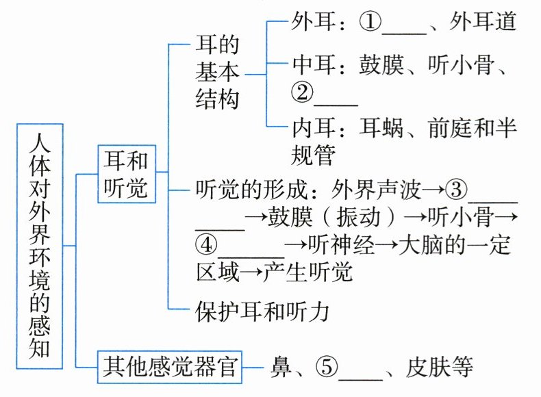 $:收集声波\\ ②外耳道:将声波传到鼓膜\end{array} \right.$中耳$\left\{\begin{array}{l}[③]$