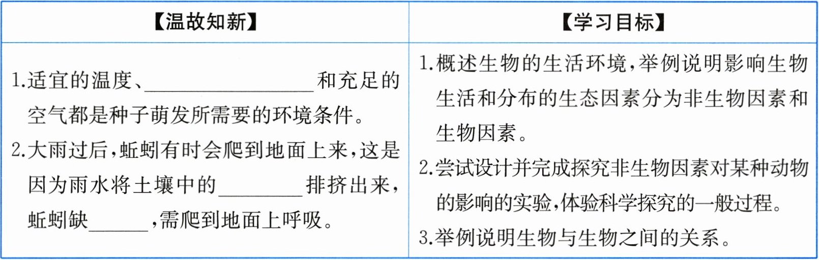 ,需爬到地面上呼吸。|1.概述生物的生活环境,举例说明影响生物生活和分布的生态因素分为非生物因素和生物因素。2.尝试设计并完成探究非生物因素对某种动物的影响的实验,体验科学探究的一般过程。