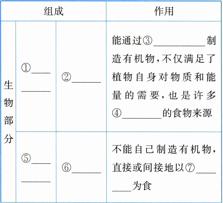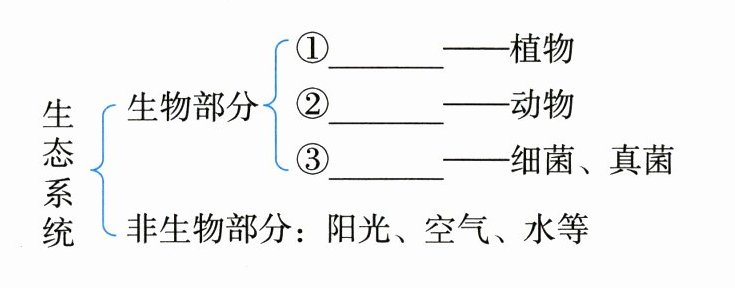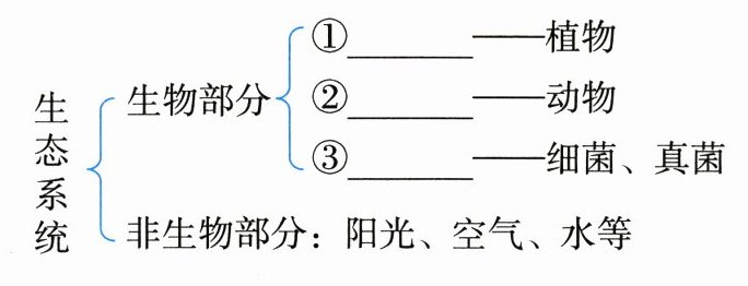 1.①生产者 ②植物 ③光合作用 ④动物 ⑤消费者 ⑥动物 ⑦植物 ⑧分解者 ⑨细菌、真菌 ⑩阳光、空气、水 2.相互依存、相互制约