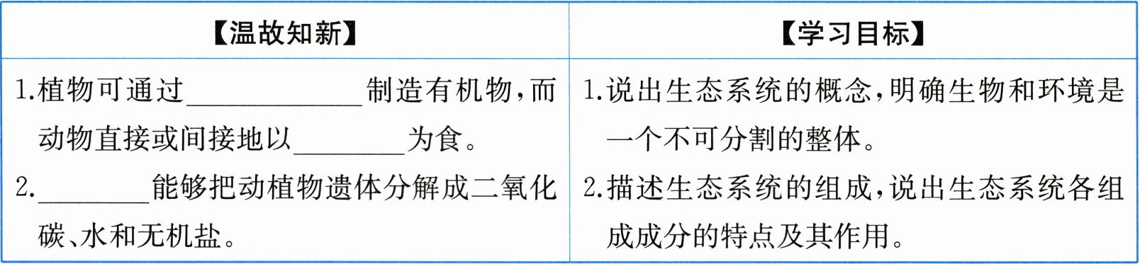 能够把动植物遗体分解成二氧化碳、水和无机盐。|1.说出生态系统的概念,明确生物和环境是一个不可分割的整体。2.描述生态系统的组成,说出生态系统各组成成分的特点及其作用。|