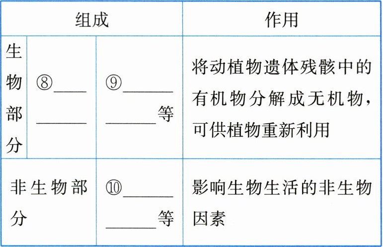 等|将动植物遗体残骸中的有机物分解成无机物,可供植物重新利用||非生物部分|⑩