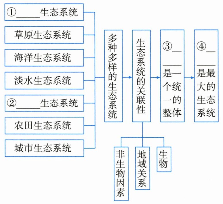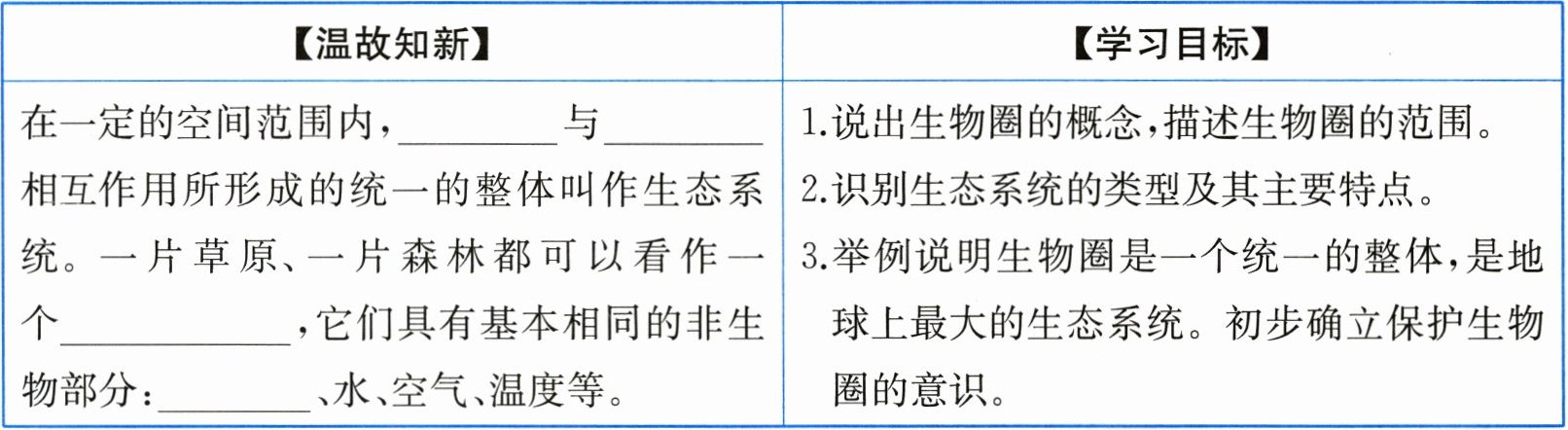 、水、空气、温度等。|1.说出生物圈的概念,描述生物圈的范围。2.识别生态系统的类型及其主要特点。