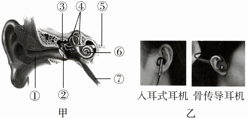 8. 研究人员根据人耳(结构如图甲)利用空气传导和骨传导传递声波的两种方式,制造出入耳式耳机和骨传导耳机(如图乙)。请据图回答下列问题。