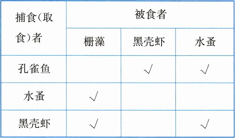(2)根据下面表格中生物之间的捕食(取食)关系,写出一条带有黑壳虾的食物链: