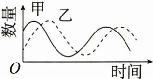 (横坐标时间,纵坐标数量,甲曲线先上升后下降再上升再下降,乙曲线类似但滞后,甲起点数量高于乙,甲上升时乙下降,甲下降时乙上升等)